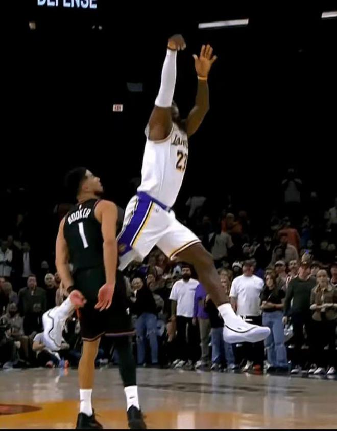 短短九秒钟,连给詹姆斯四个罚球,第一次你不争气没罚进没关系,我把对面的绝杀功臣驱逐了,再给你3个罚球,你接着罚。连罚4个之后,詹皇终于3罚2中帮助湖人反超绝杀,而这个球可以看到,布克去防勒布朗的时候,整个人已经背着手了,而且詹皇在空中大劈叉投篮,裁判竟然还是硬吹了犯规。